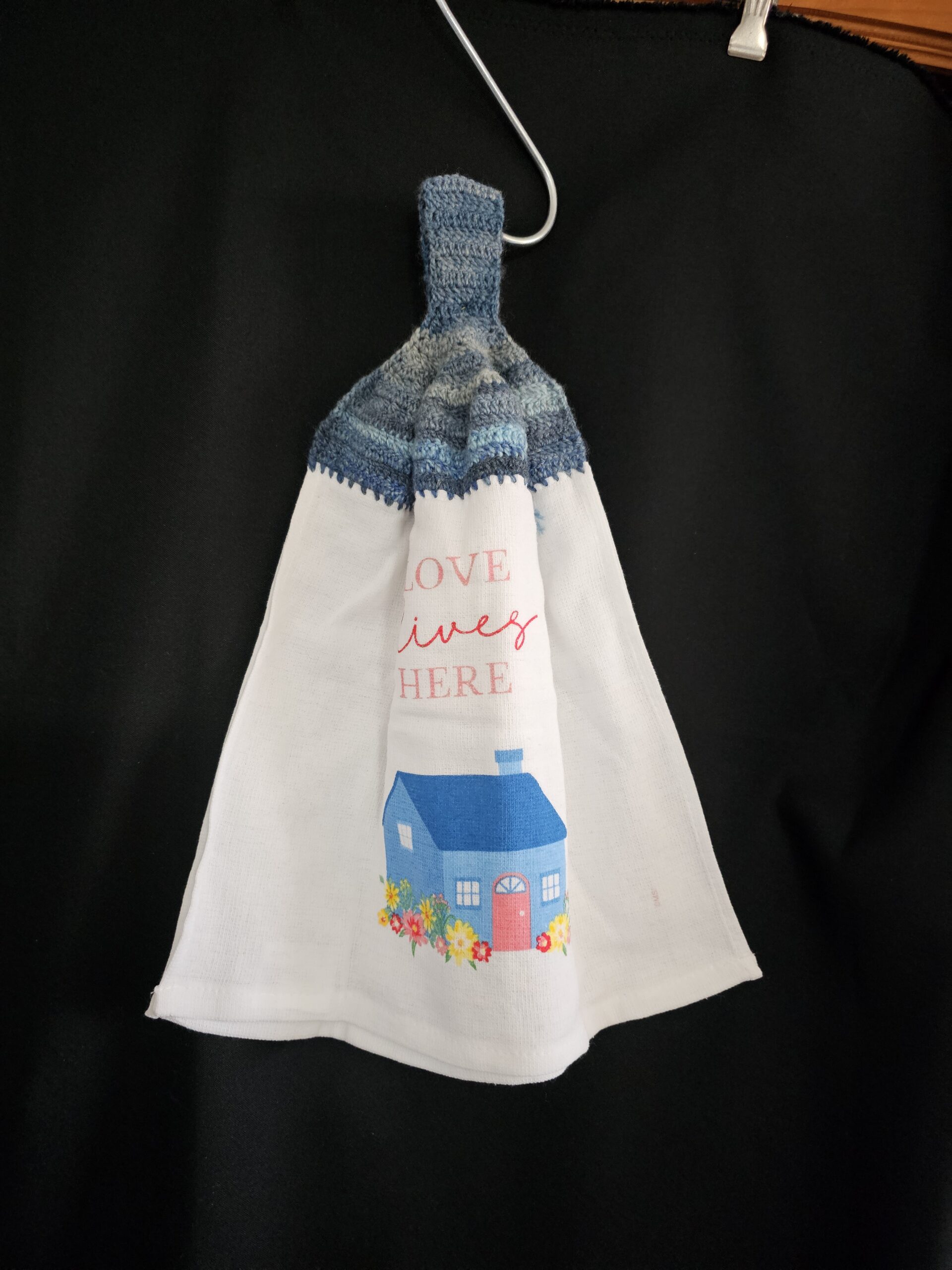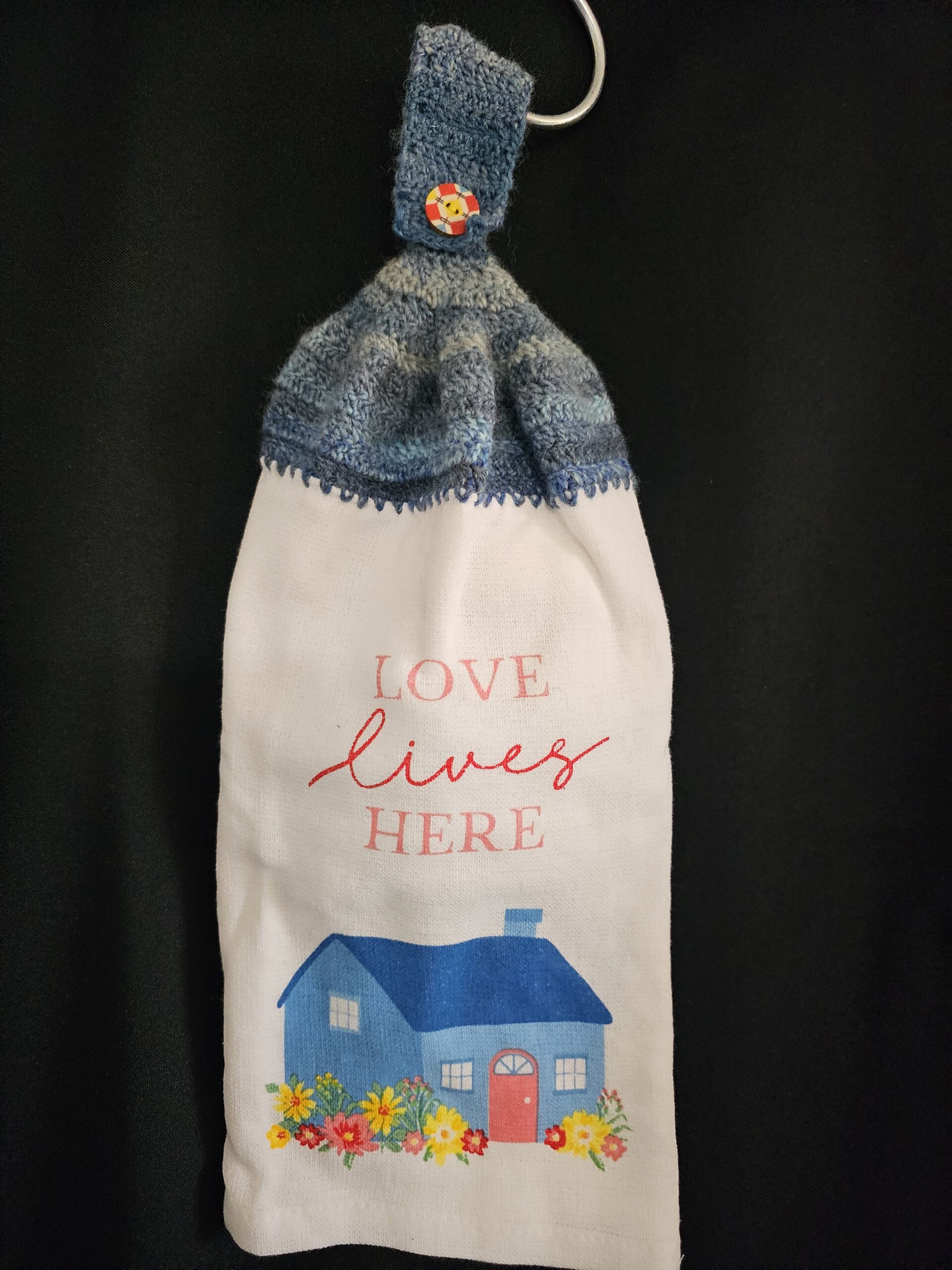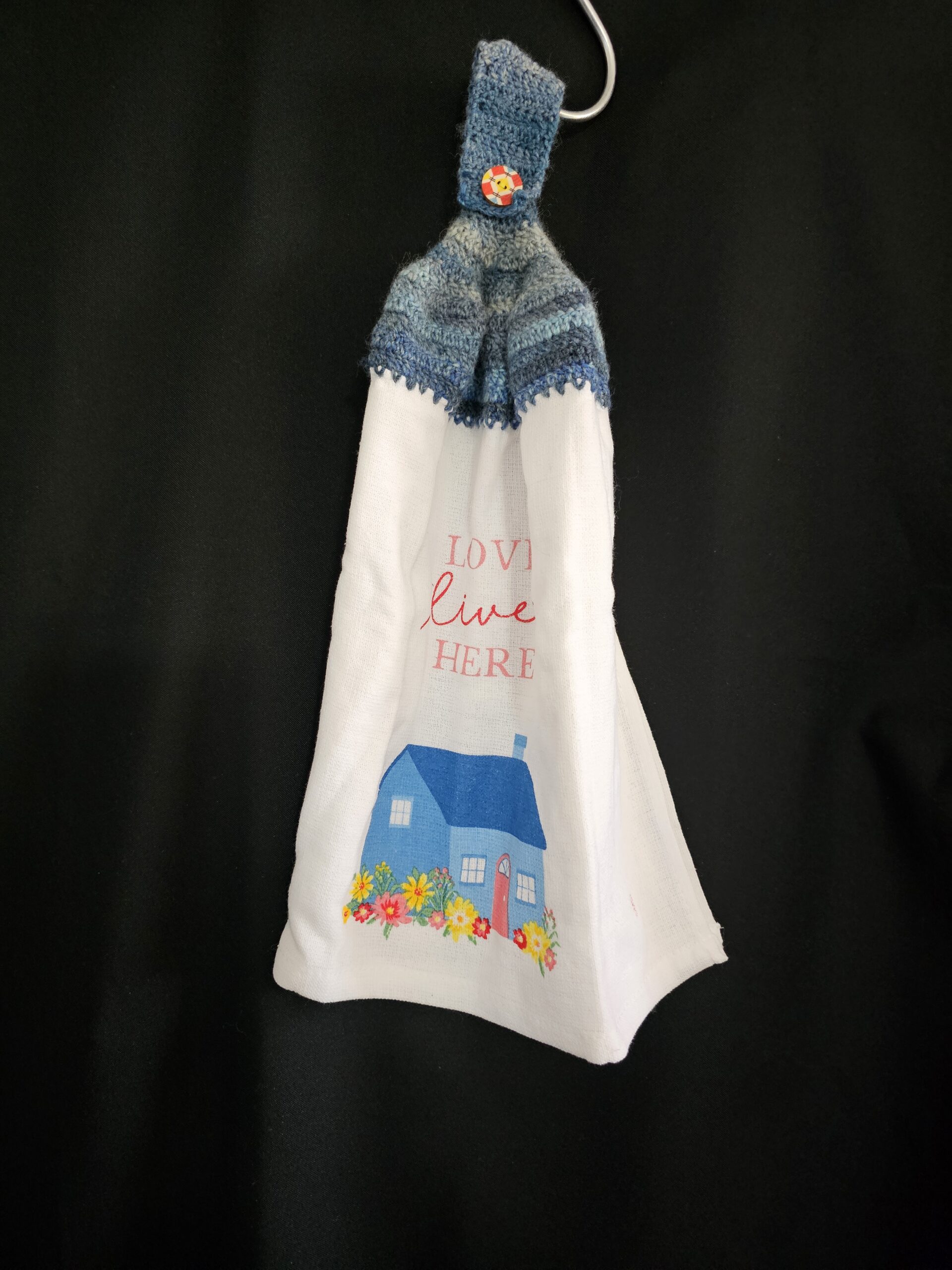 Blue Crochet Top with with Flowers and a Home – Love Lives Here Double Tea Towel and Round Button