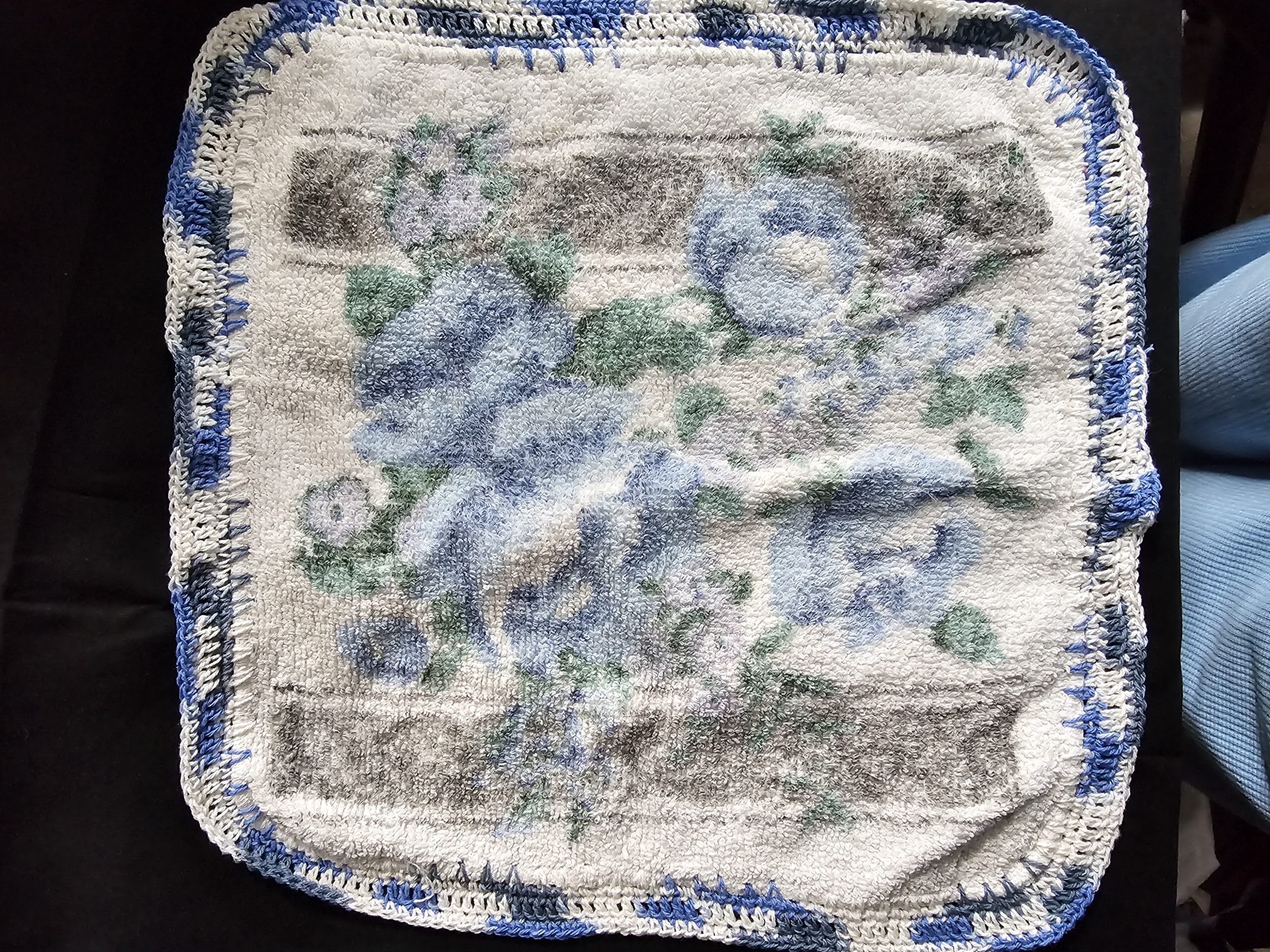Toweling Blue Flower Washer with Varigated Blue Crochet Edge