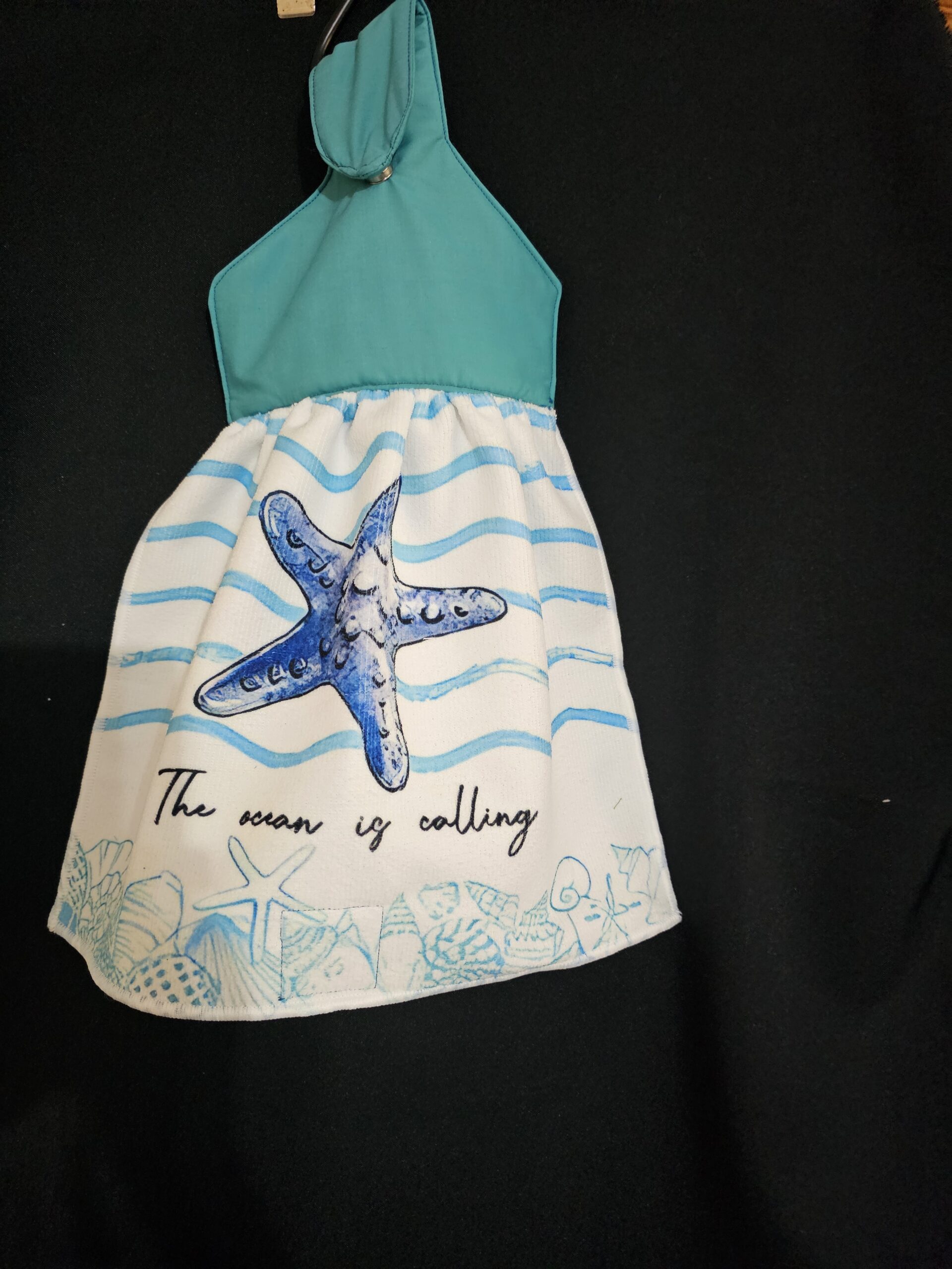 Blue Top with Star Fish “The ocean is calling” Single Tea Towel and Magnetic Closure