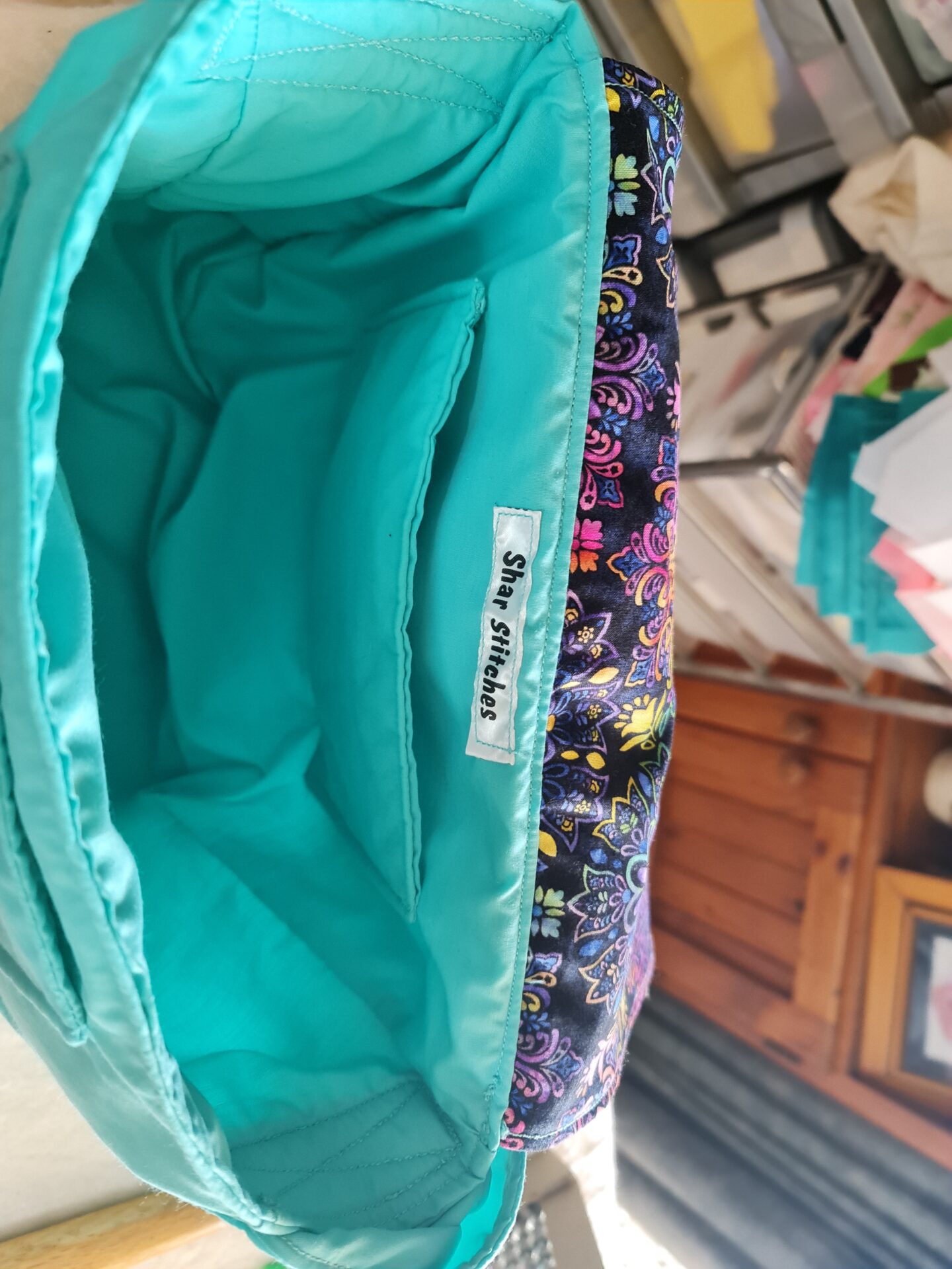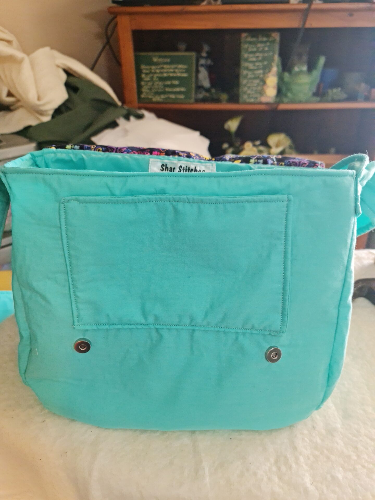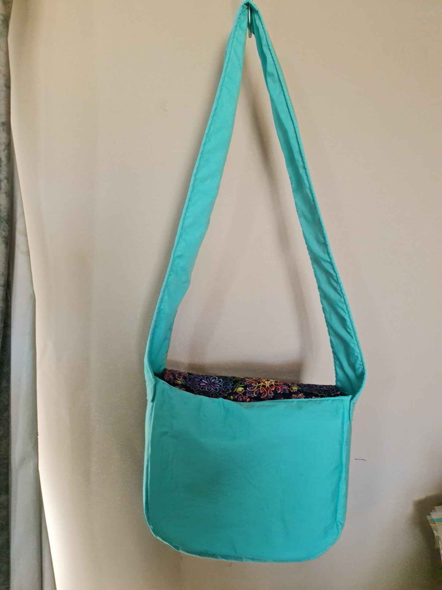 This Satchel Bag is 30cm wide x 25cm height x 10cm depth. It has a long handle so you can wear across your body.  Two large pockets inside.