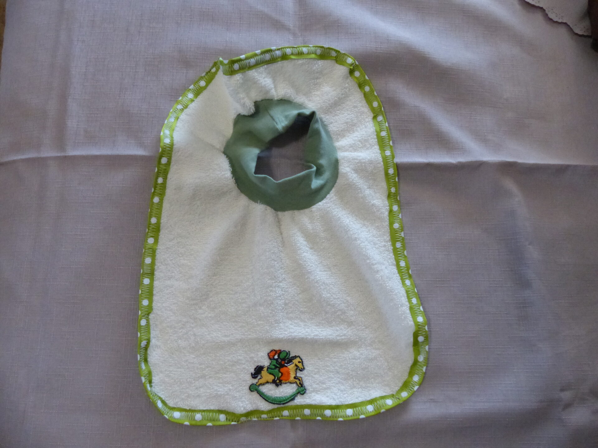 Toweling Bib with Rib Neck Line – Cream Bib with Green Neck-Green with White Dots Ribbon and Rocking Horse