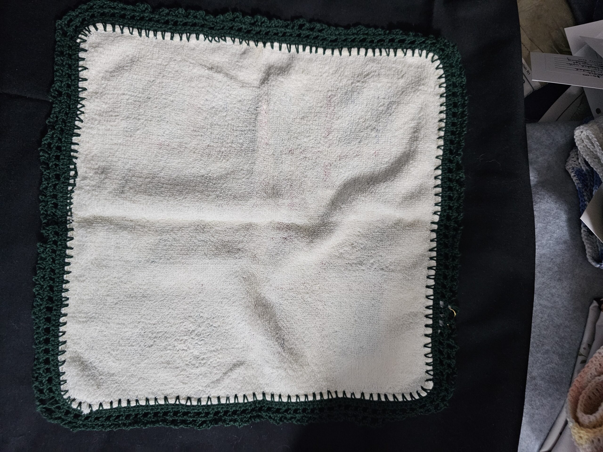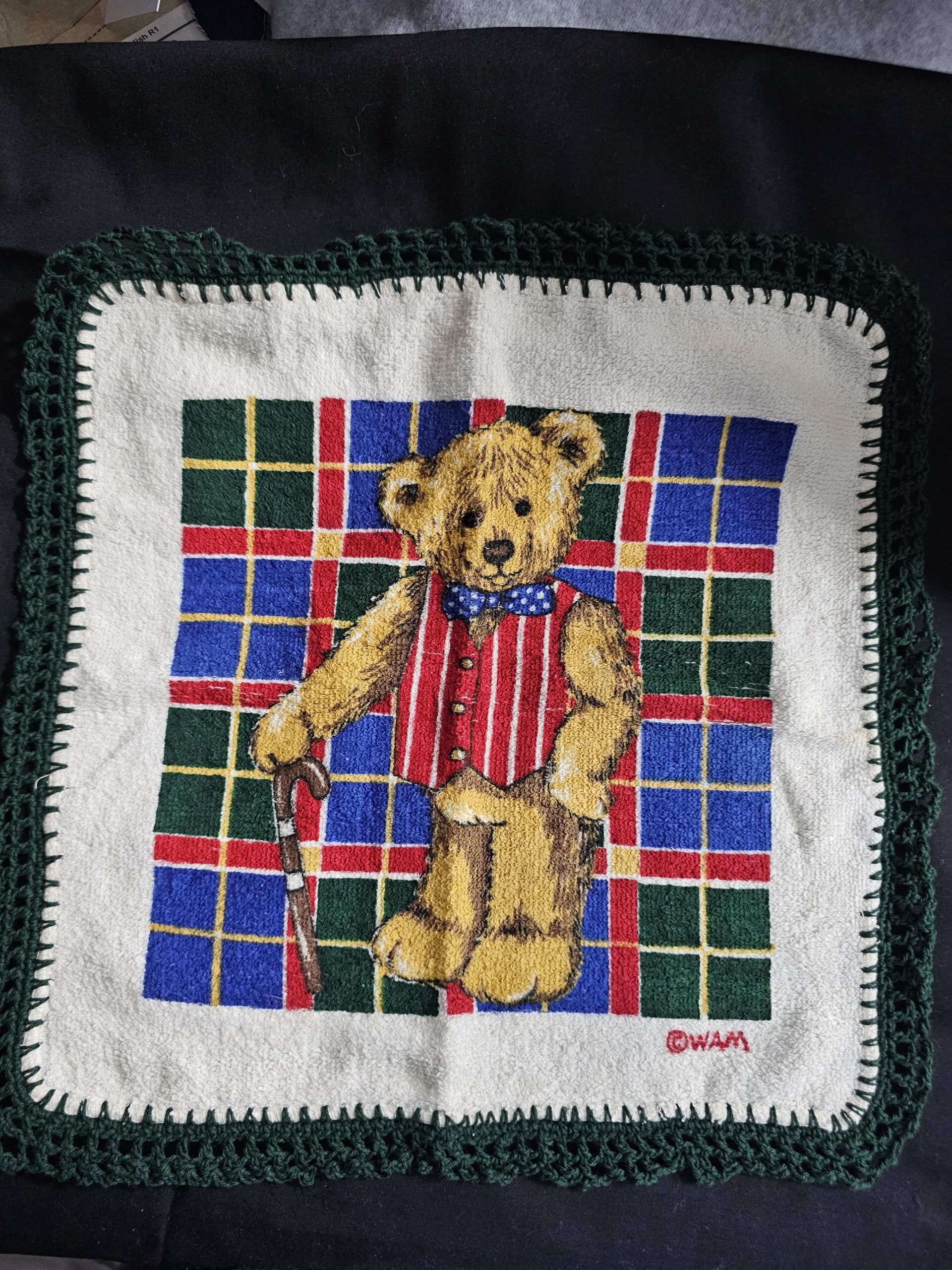 Cream Toweling Washer with Bear with Walking Stick and Green Crochet Edge