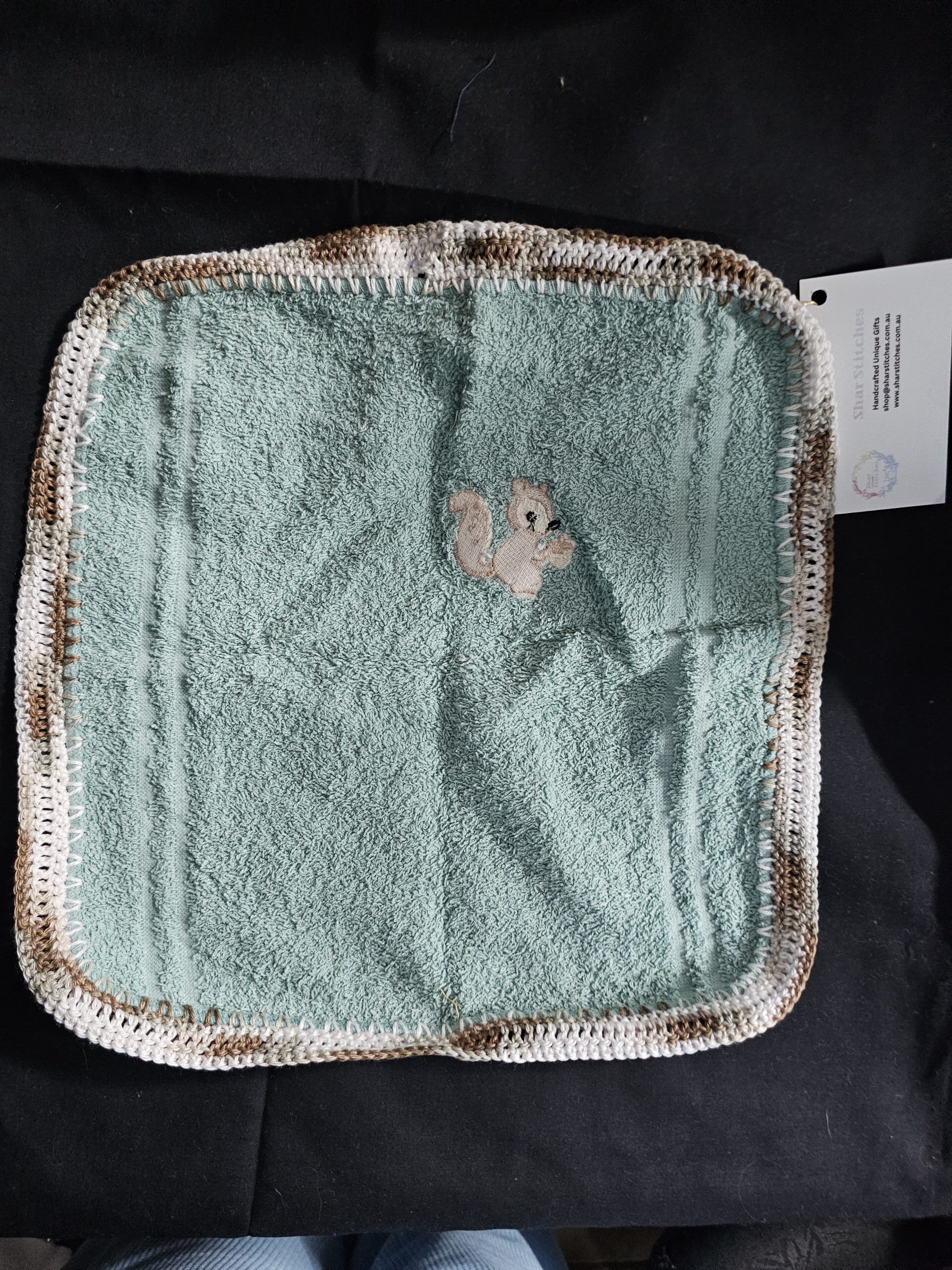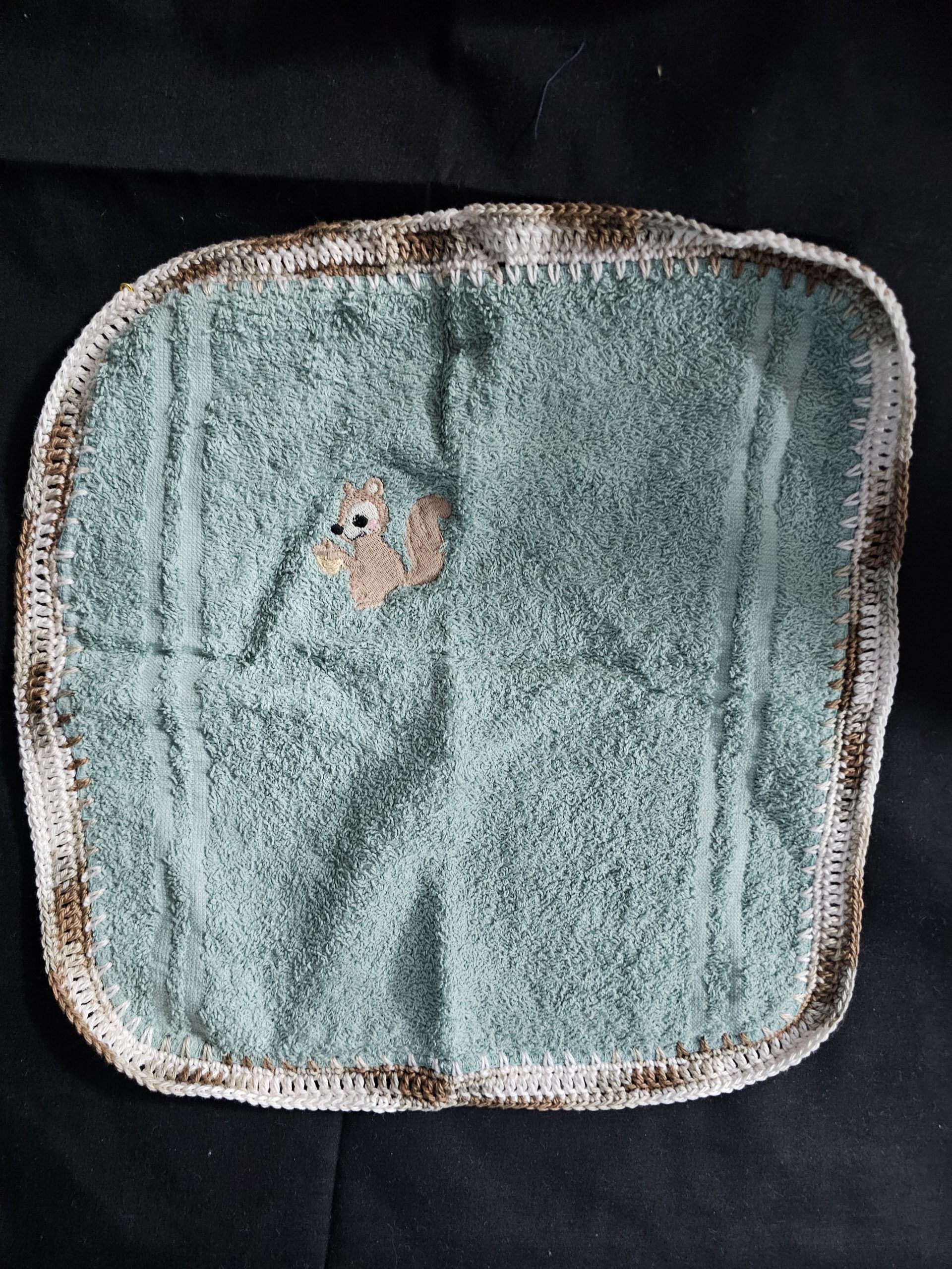 Green Toweling Washer with Embroidered Squirrel and Varigated White and Brown Crochet Edge