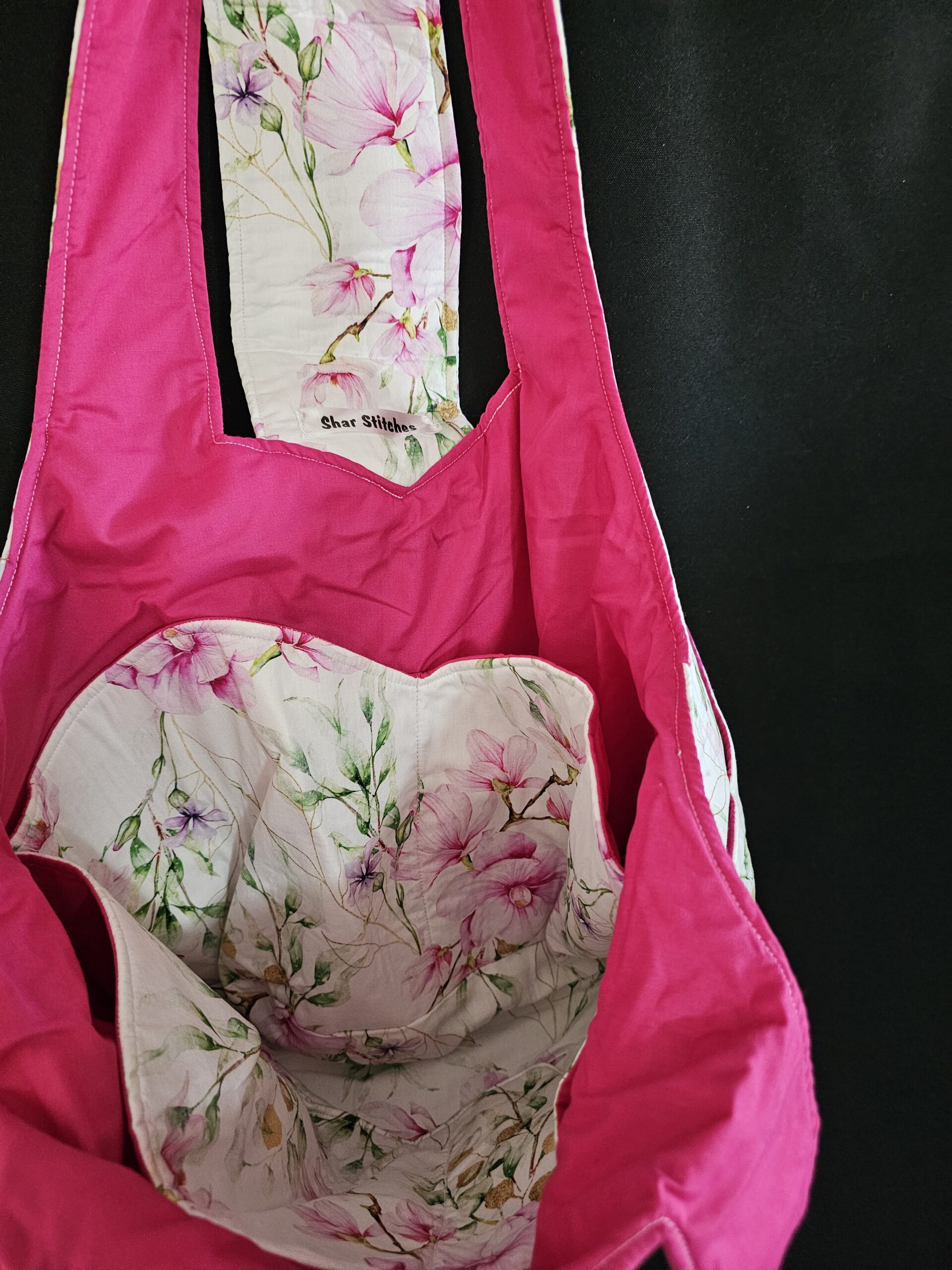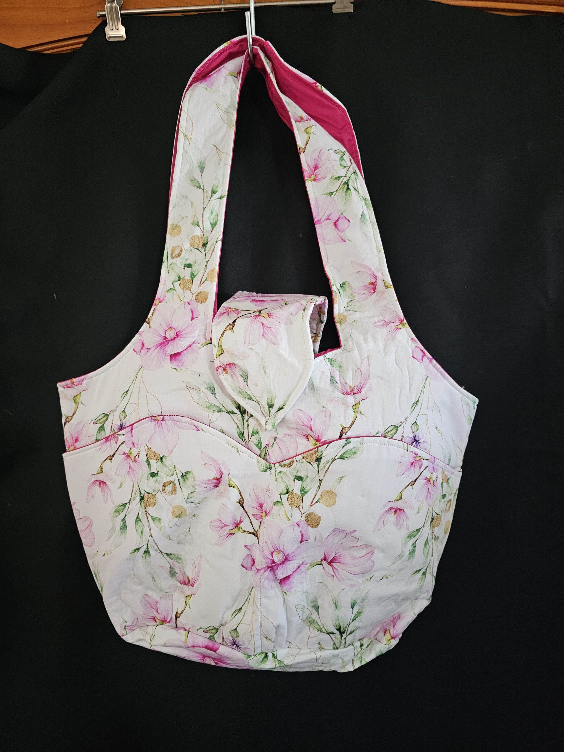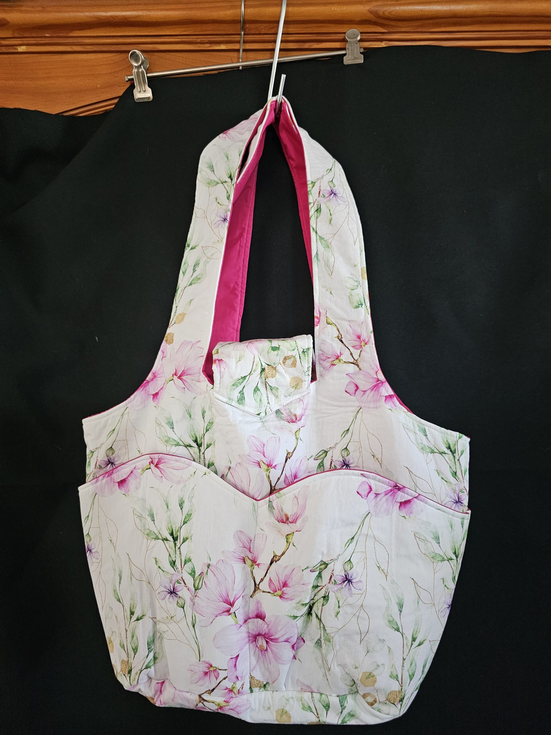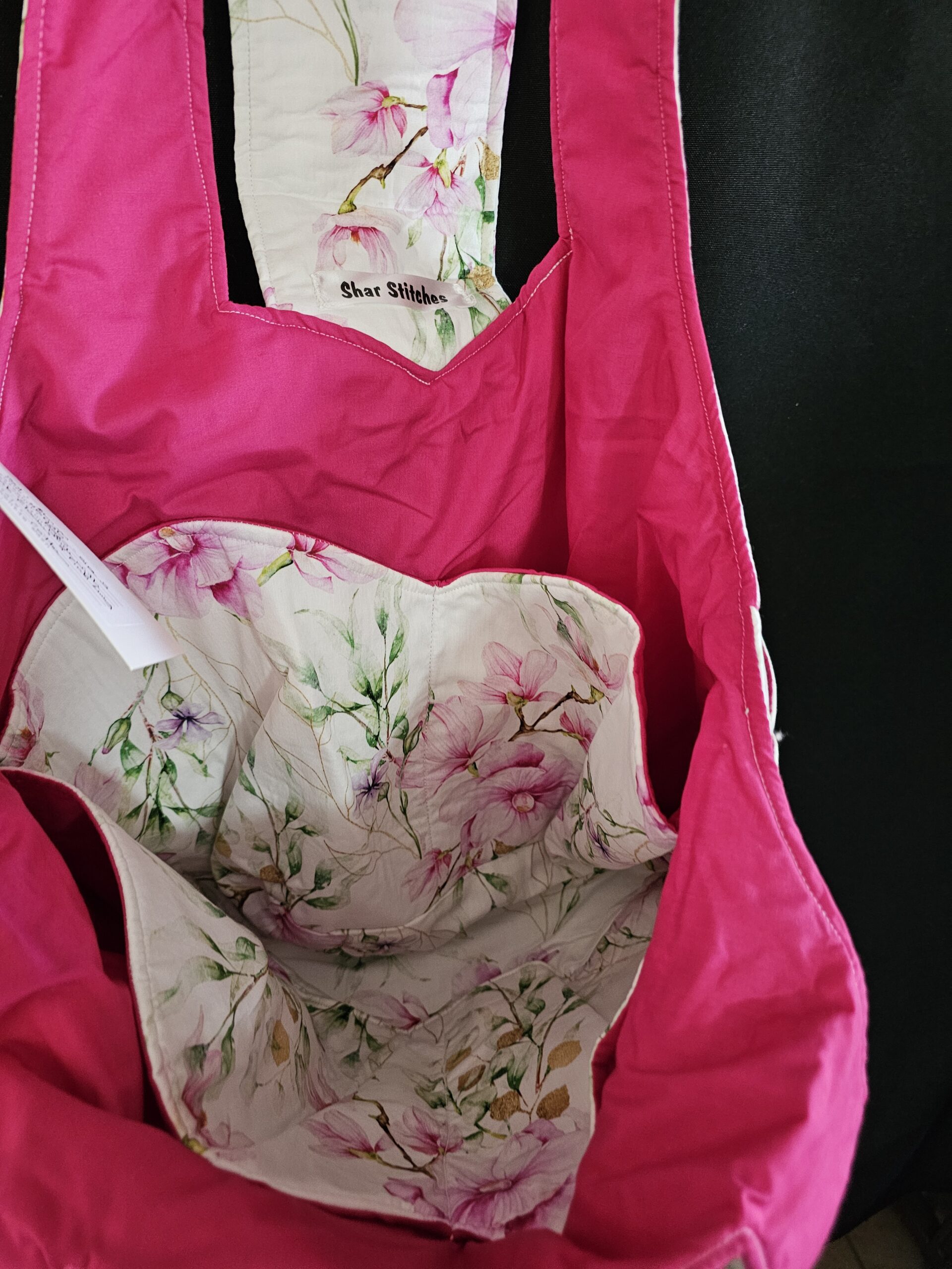 Large Hand Bag White with Pink Flowers & Pink Lining