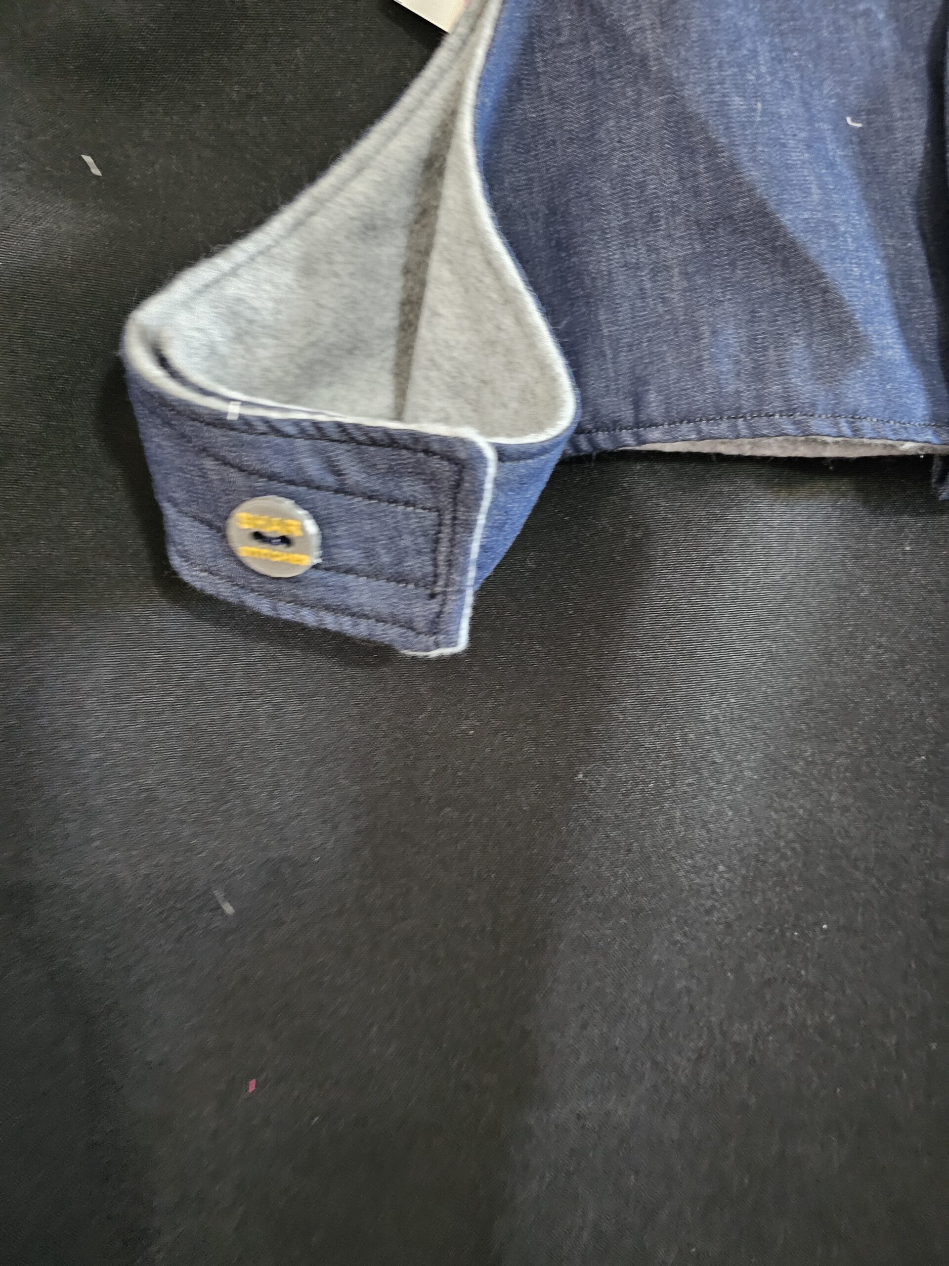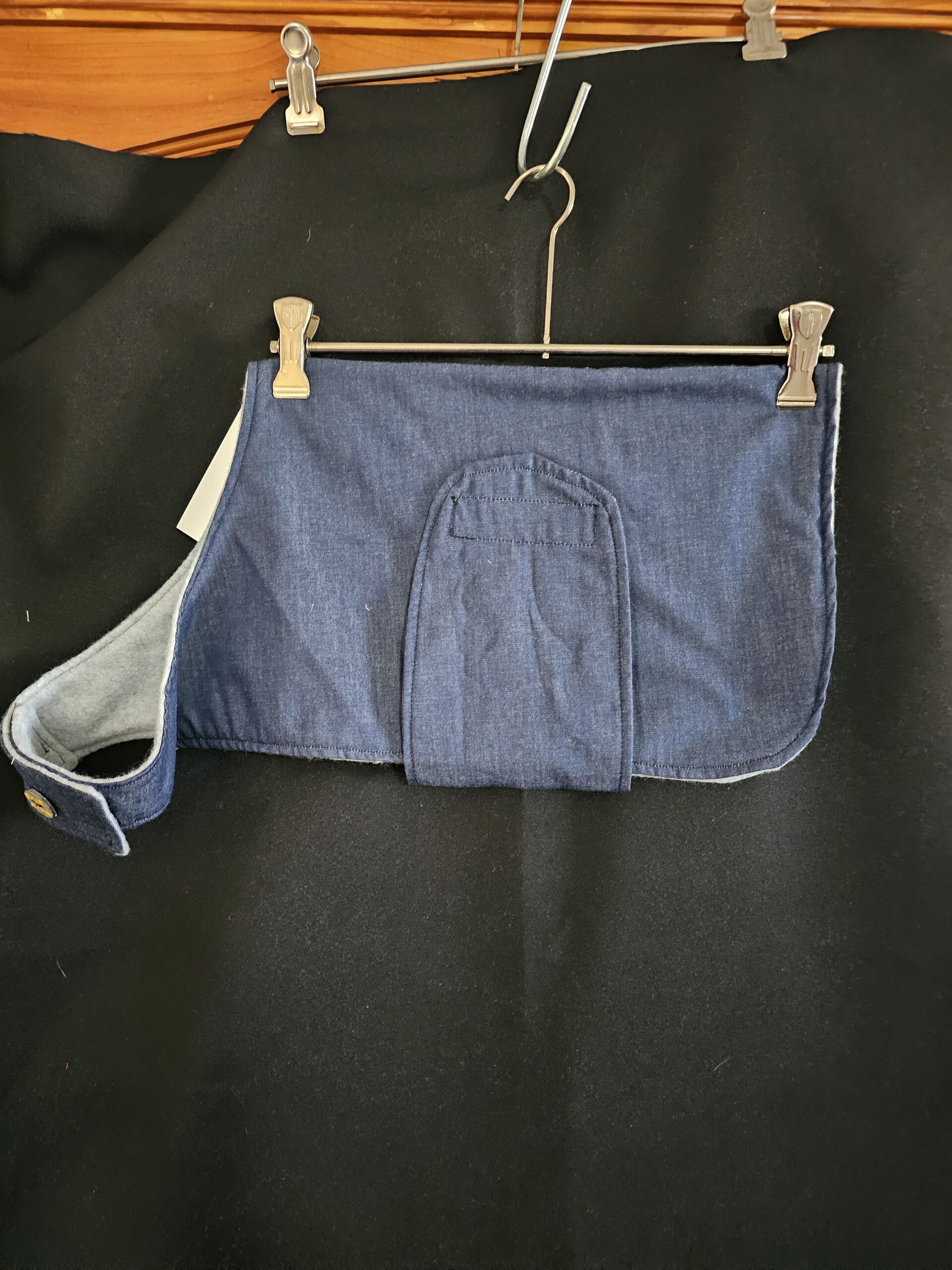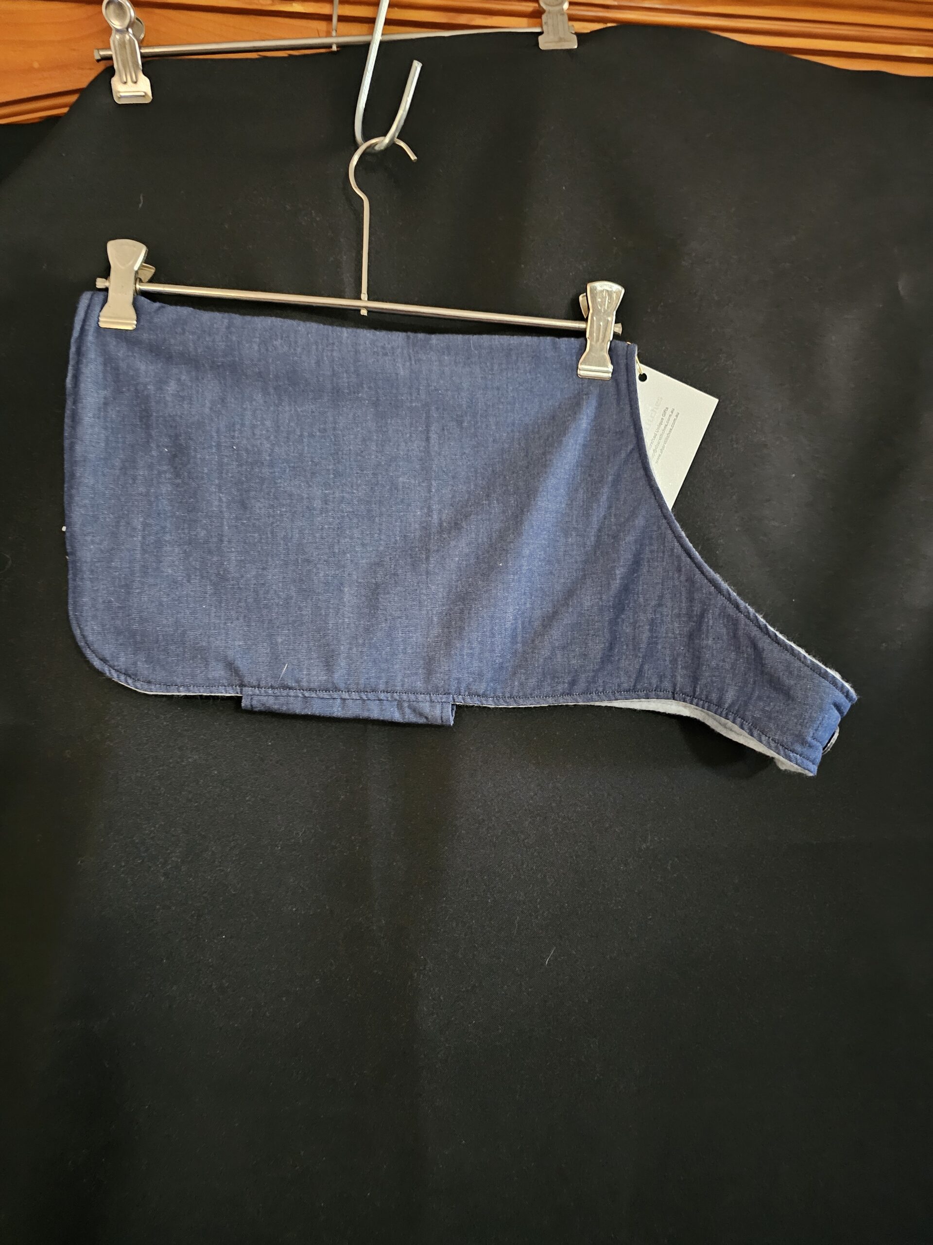 Medium Denim Dog Coat with Grey Fleece Lining – 32.5 cm from back of neck to tail – 52 cm girth (adjustable).