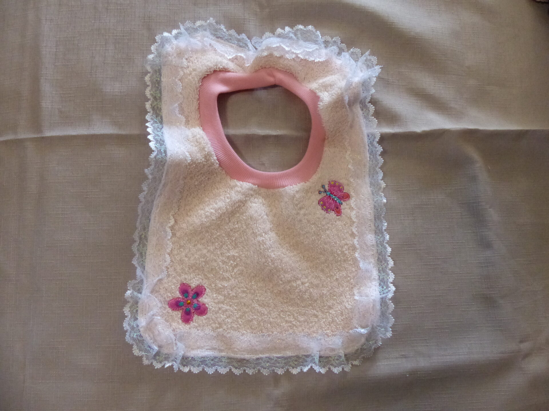 Toweling Bib with Rib Neck Line – Pink Bib with Pink Neck White Lace with Flower & Butterfly