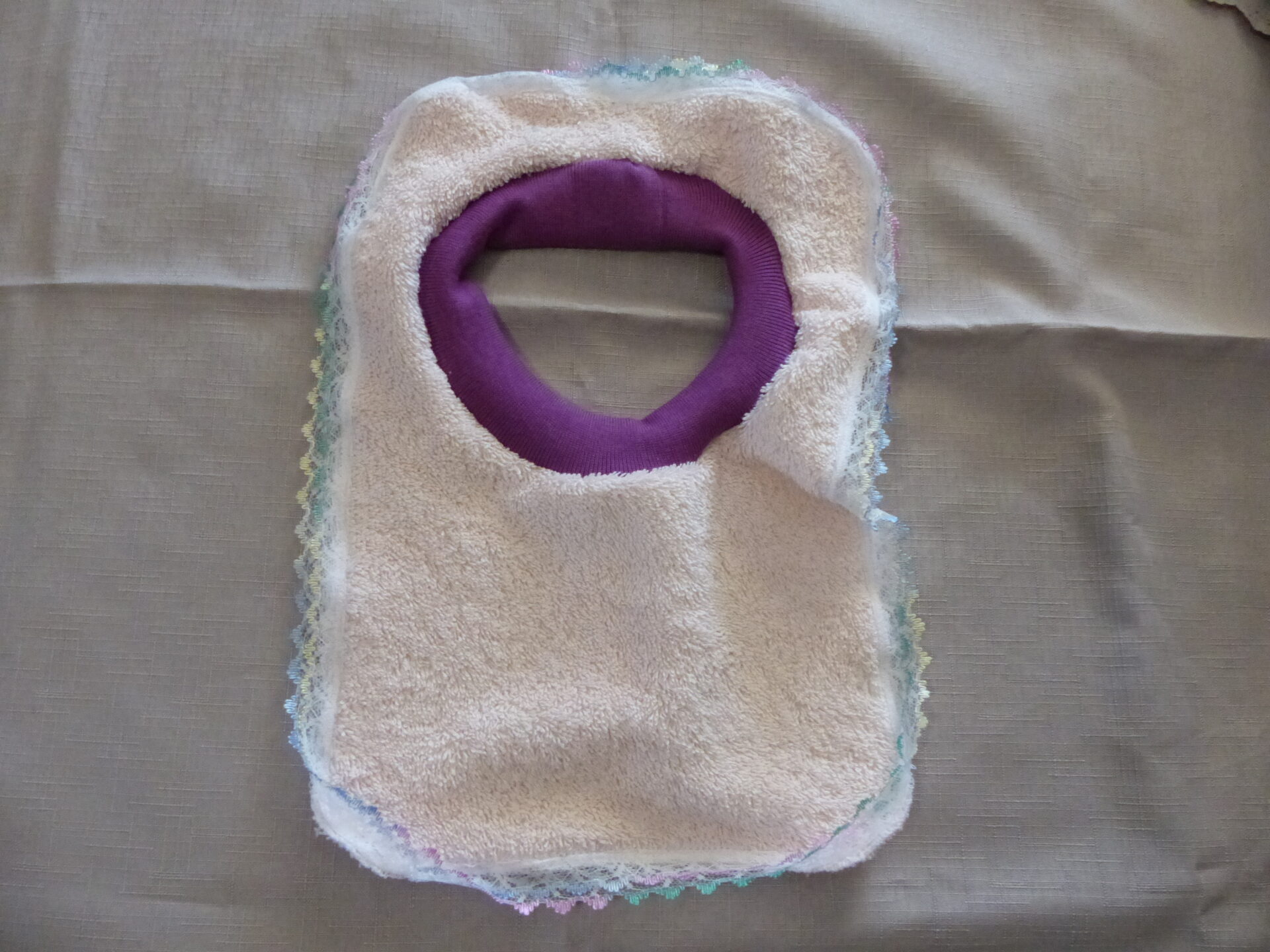 Toweling Bib with Rib Neck Line – Pink Bib with Purple Neck and Rainbow and White Lace