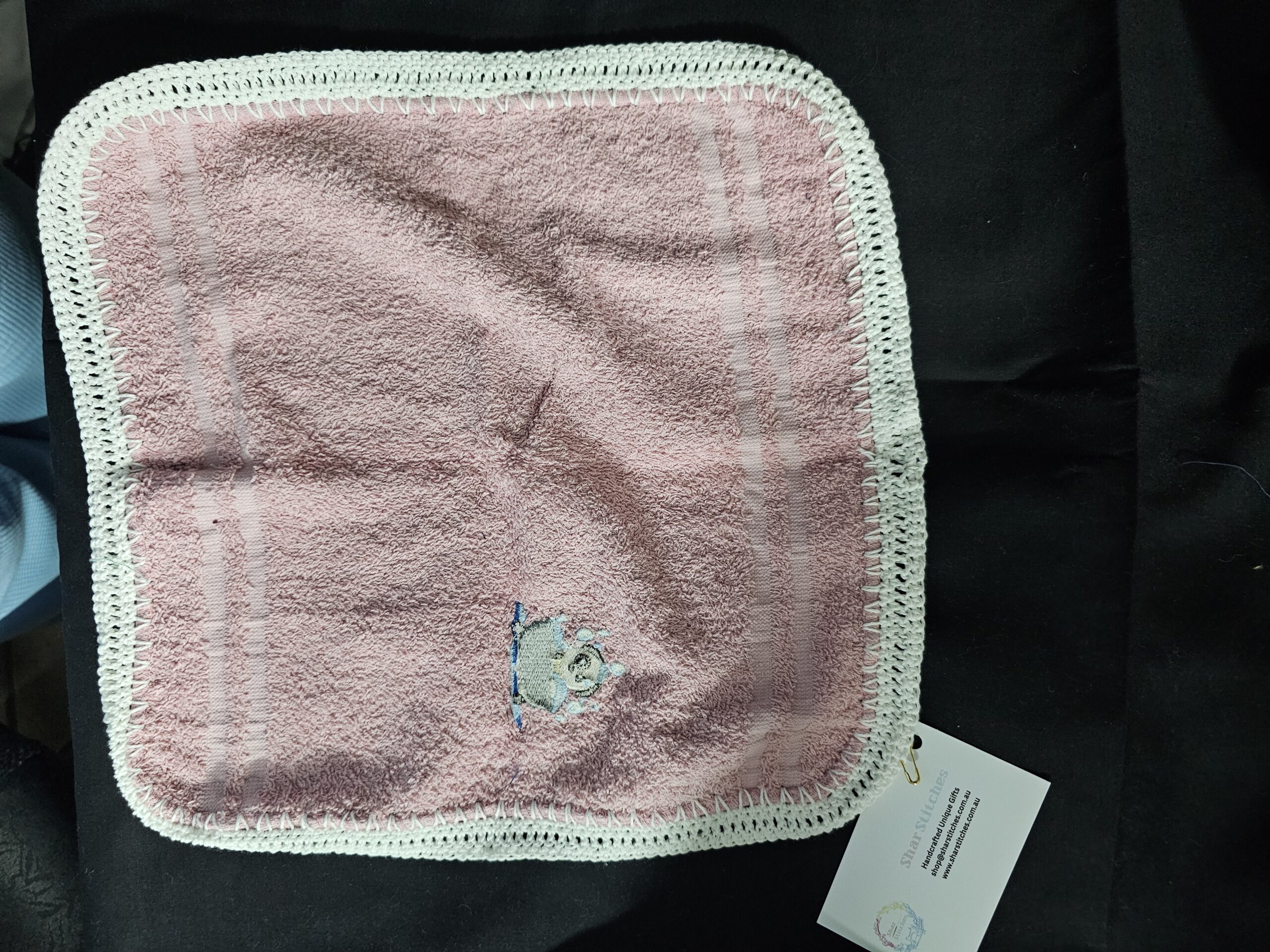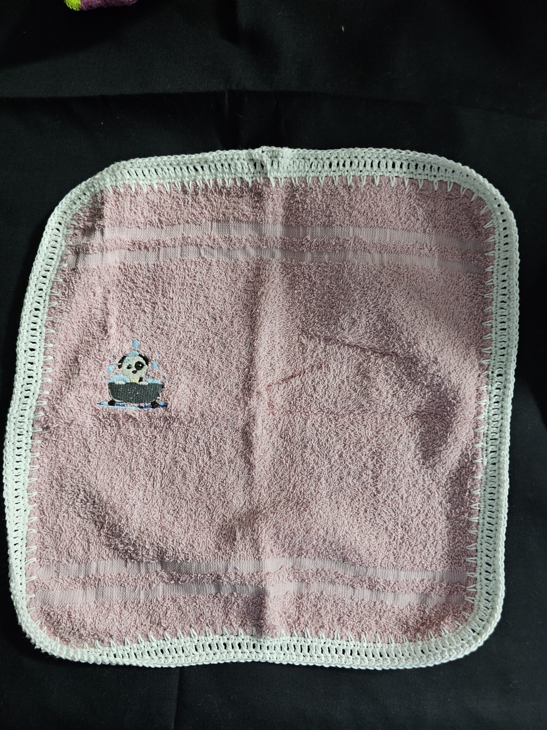 Pink Toweling Washer with Embroidered Dog in Bath and White Crochet Edge