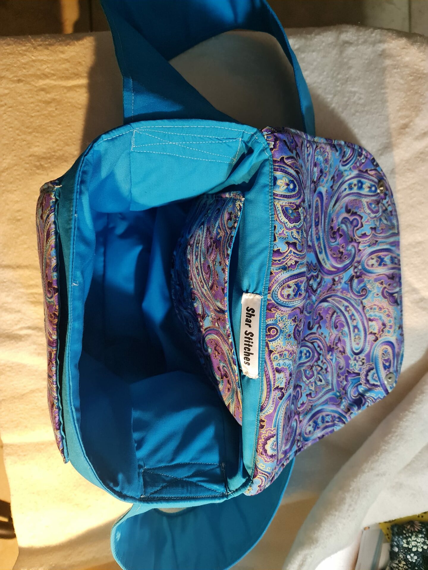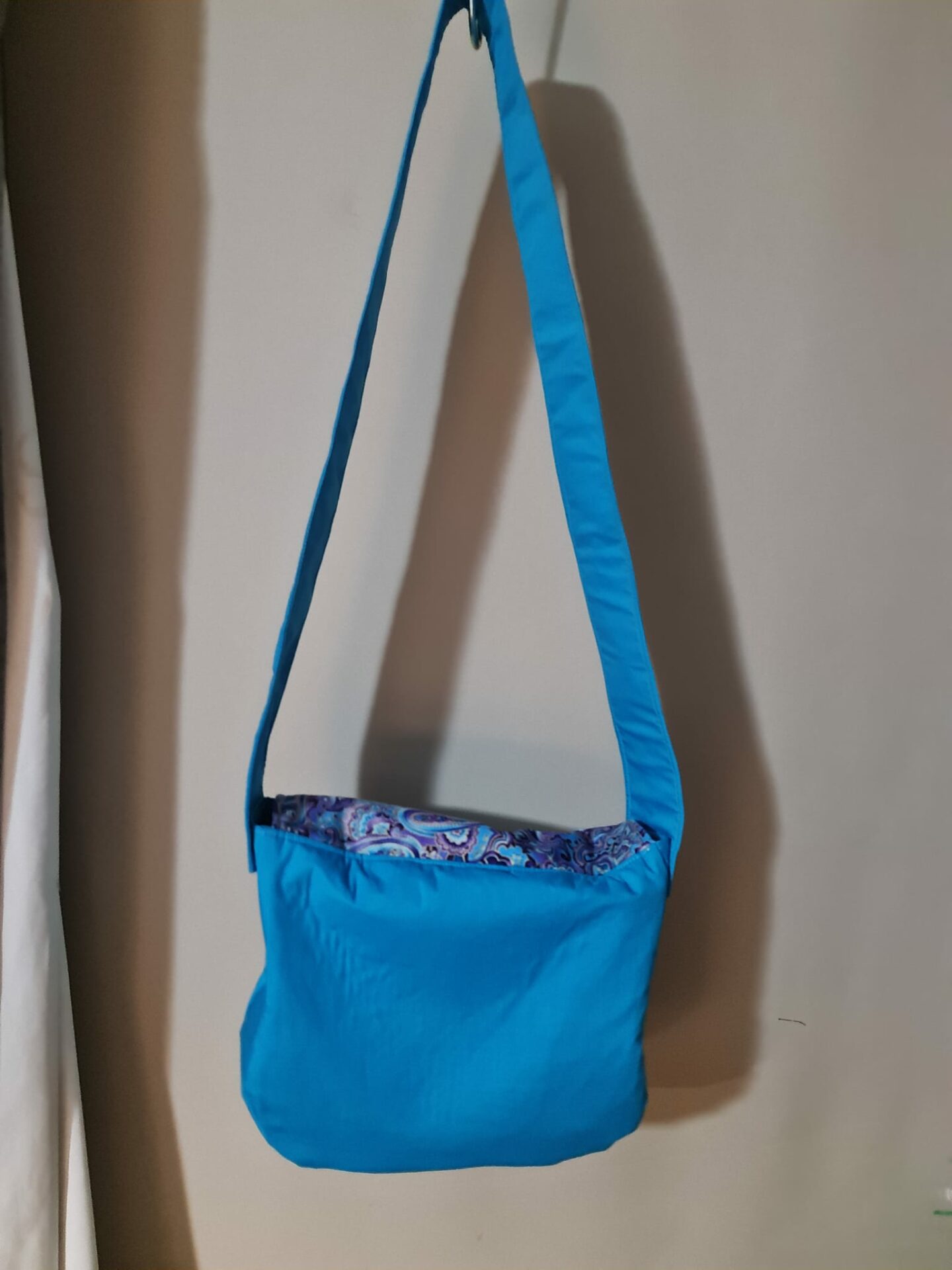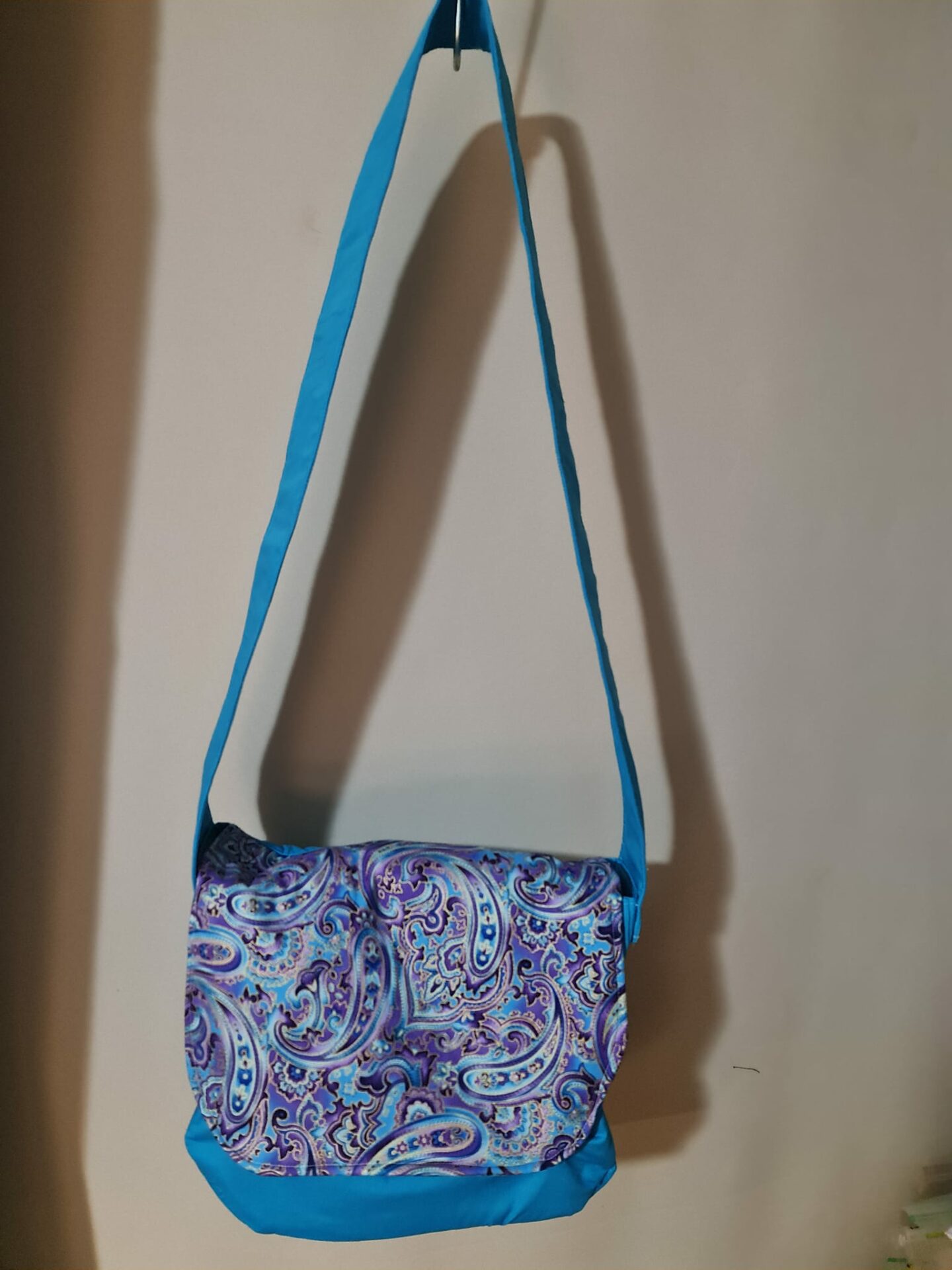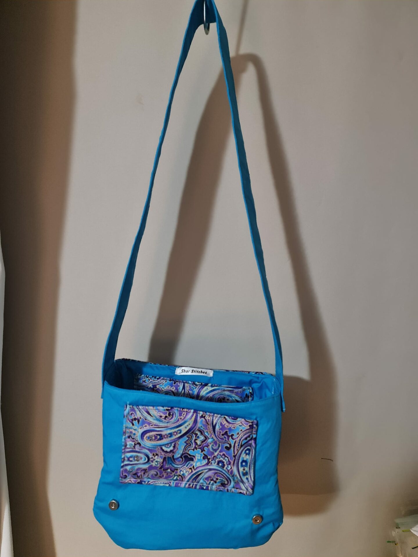 This Satchel Bag is 30cm wide x 22cm height x 10cm depth. It has a long handle so you can wear across your body. Two large pockets inside.