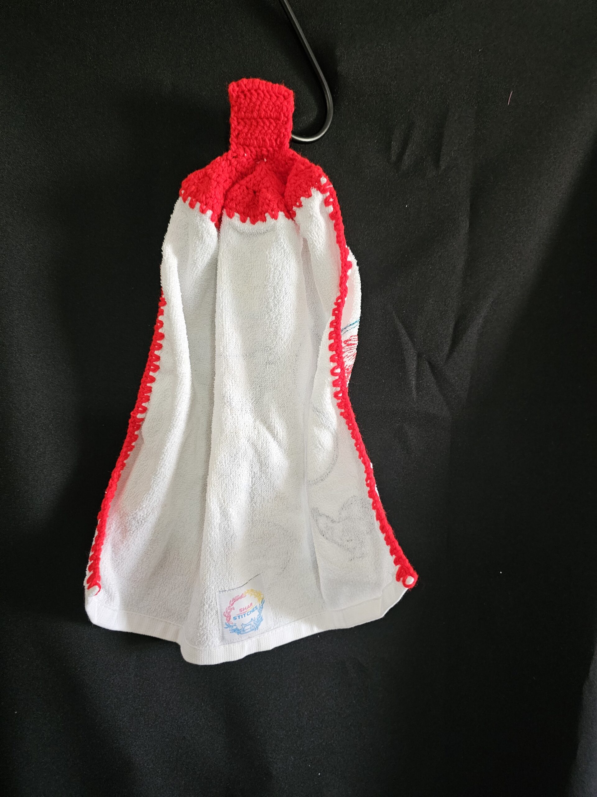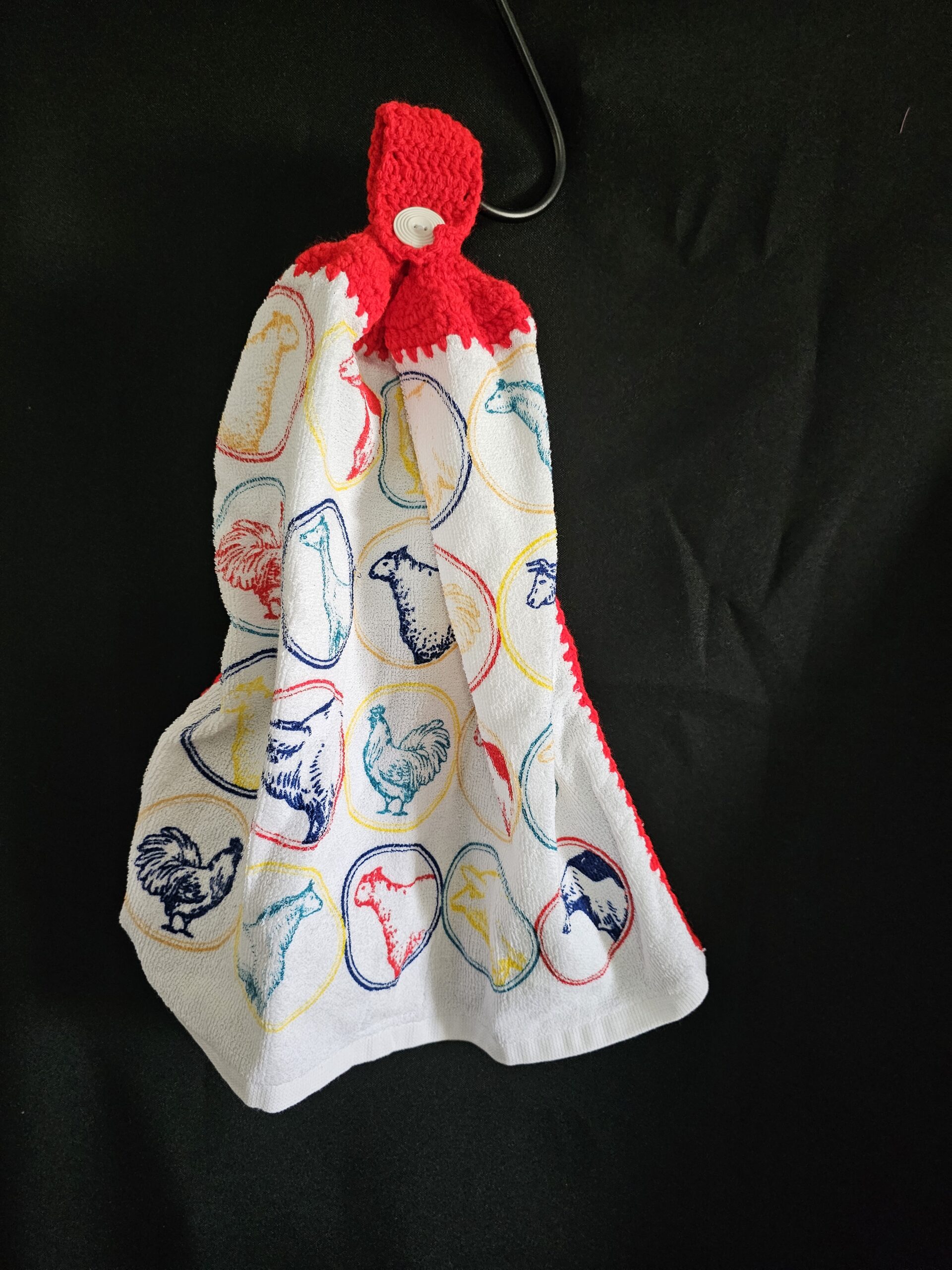 Red Crochet Top and Sides on Multi Animal Tea Towel with White Button