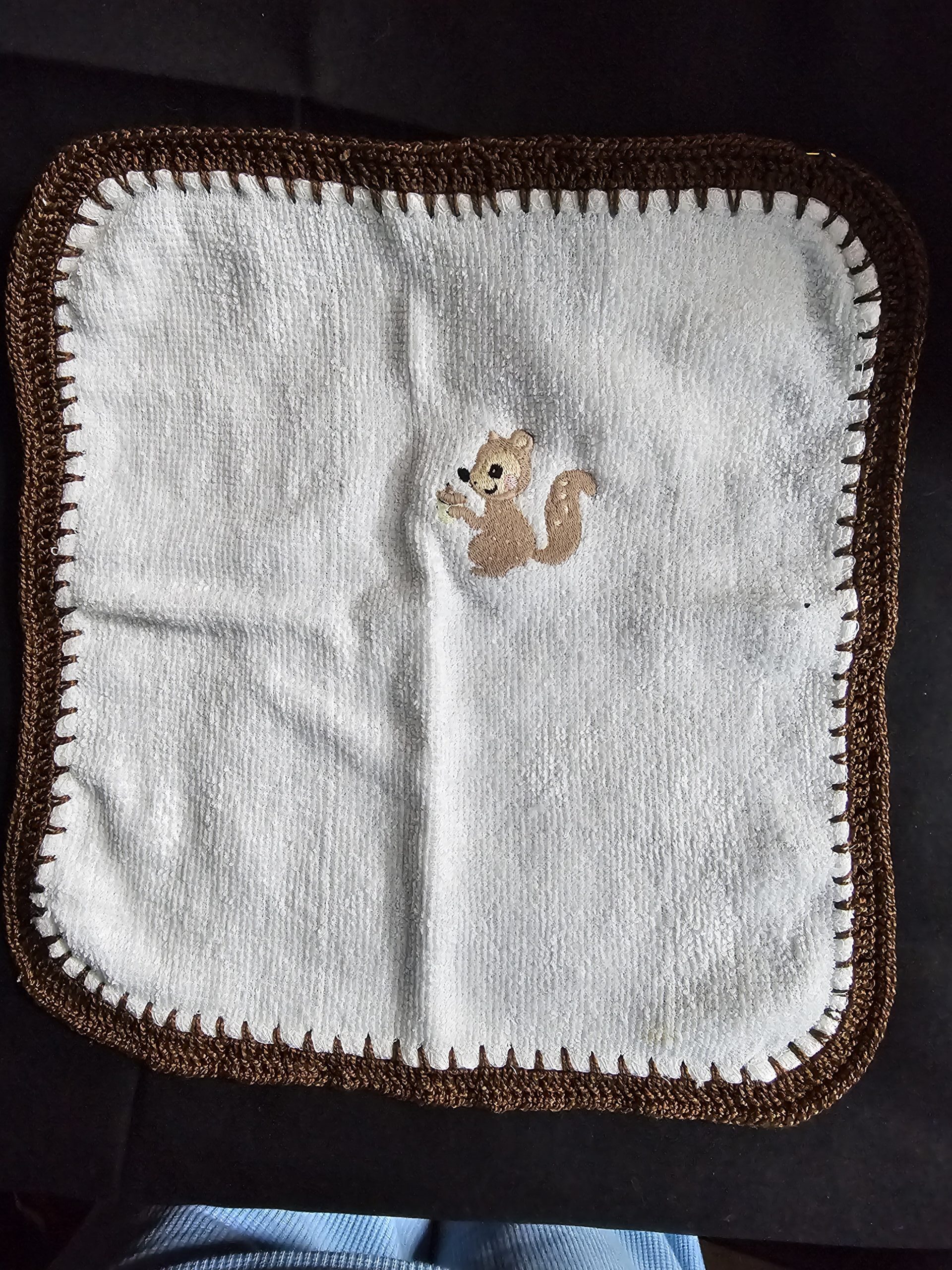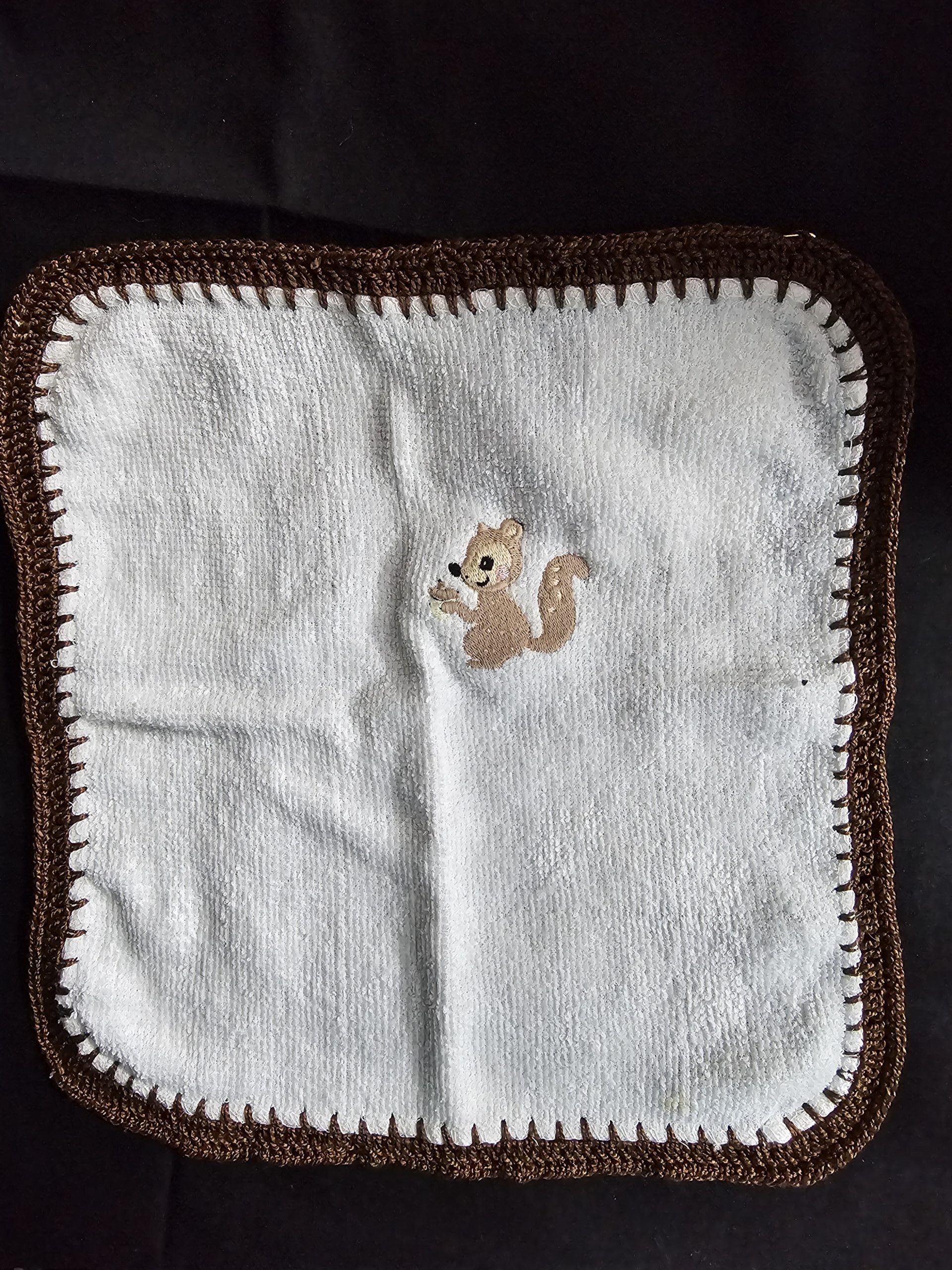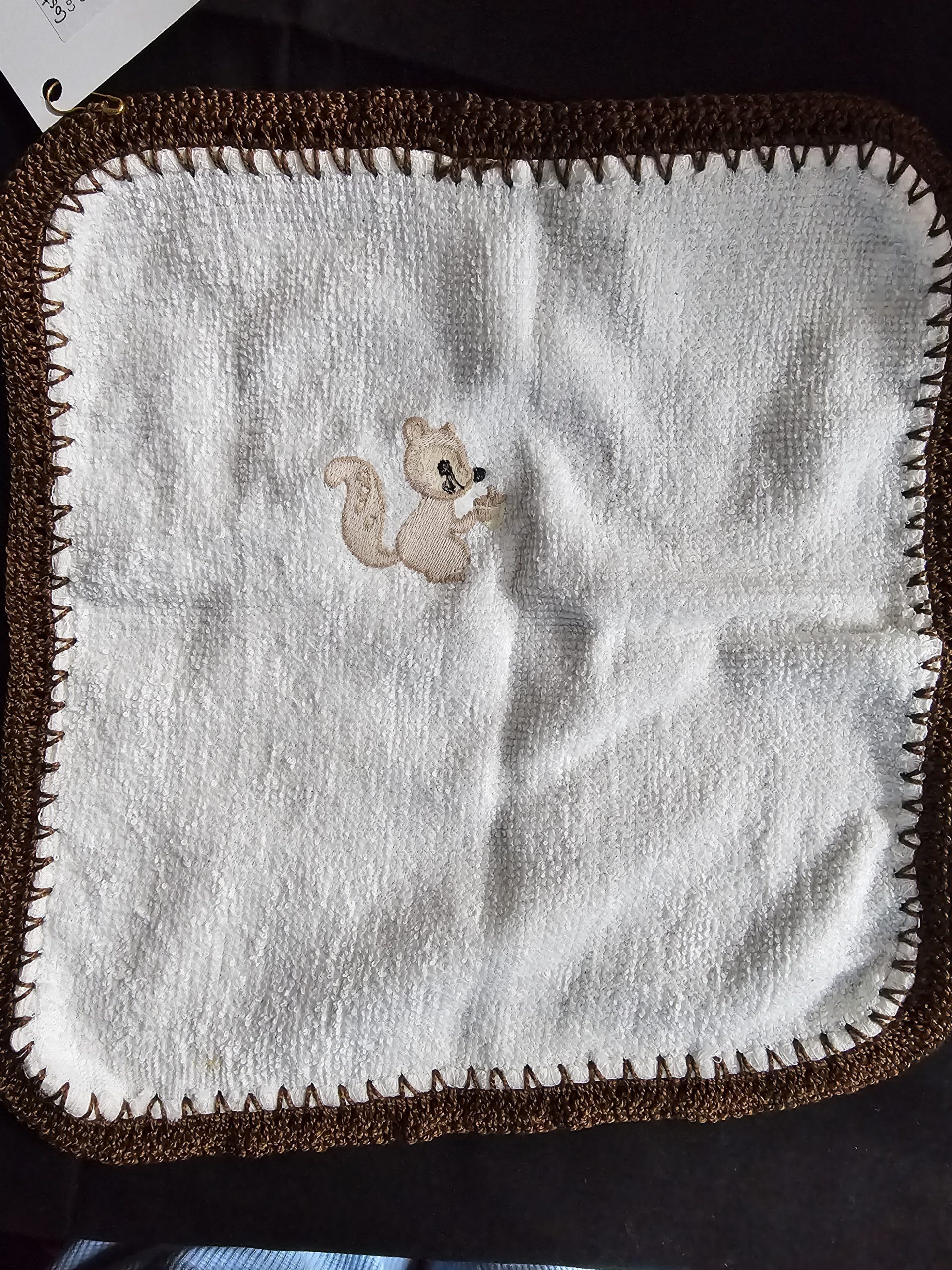 White Toweling Washer with Embroidered Squirrel with Brown Crochet Edge