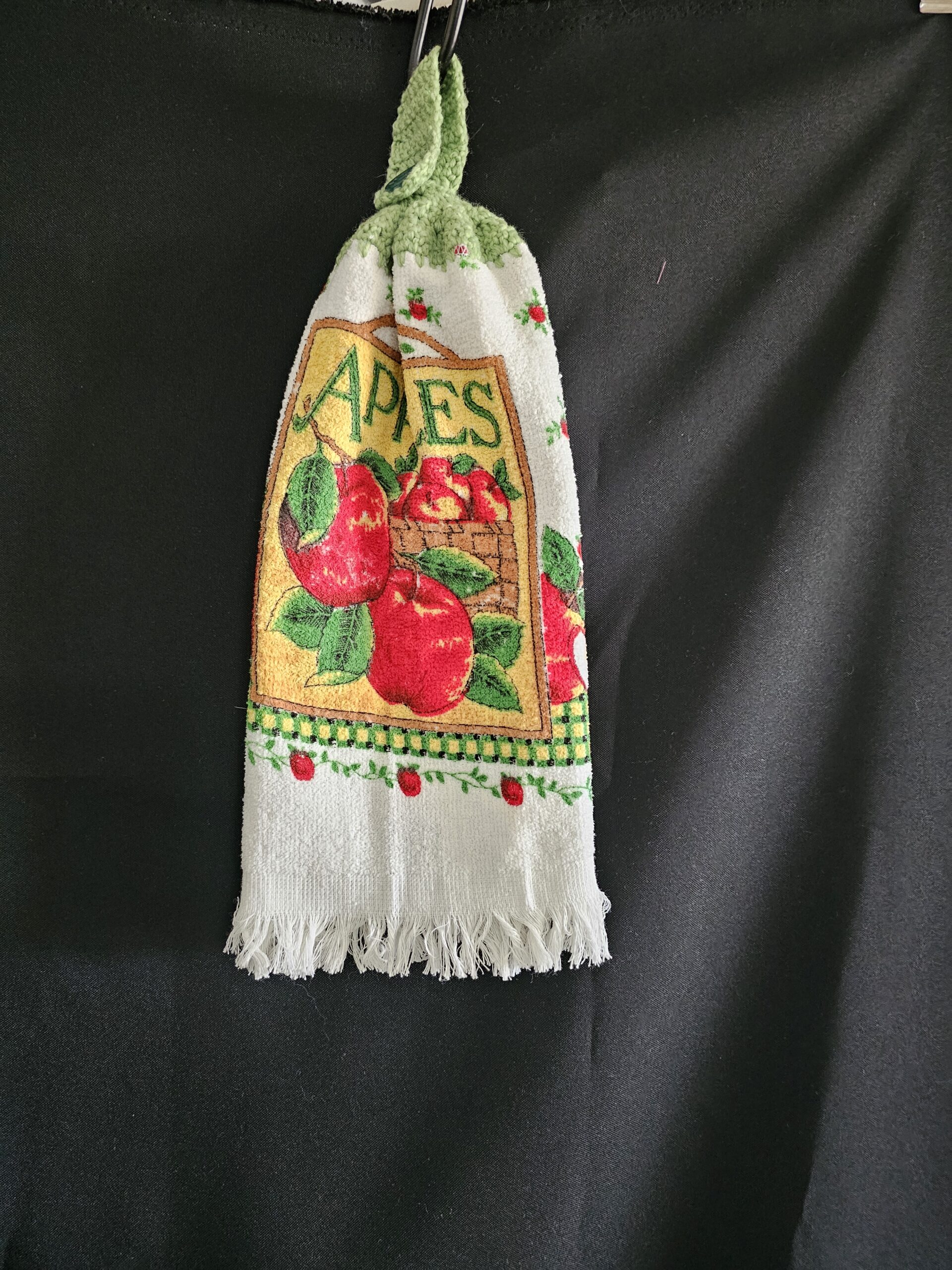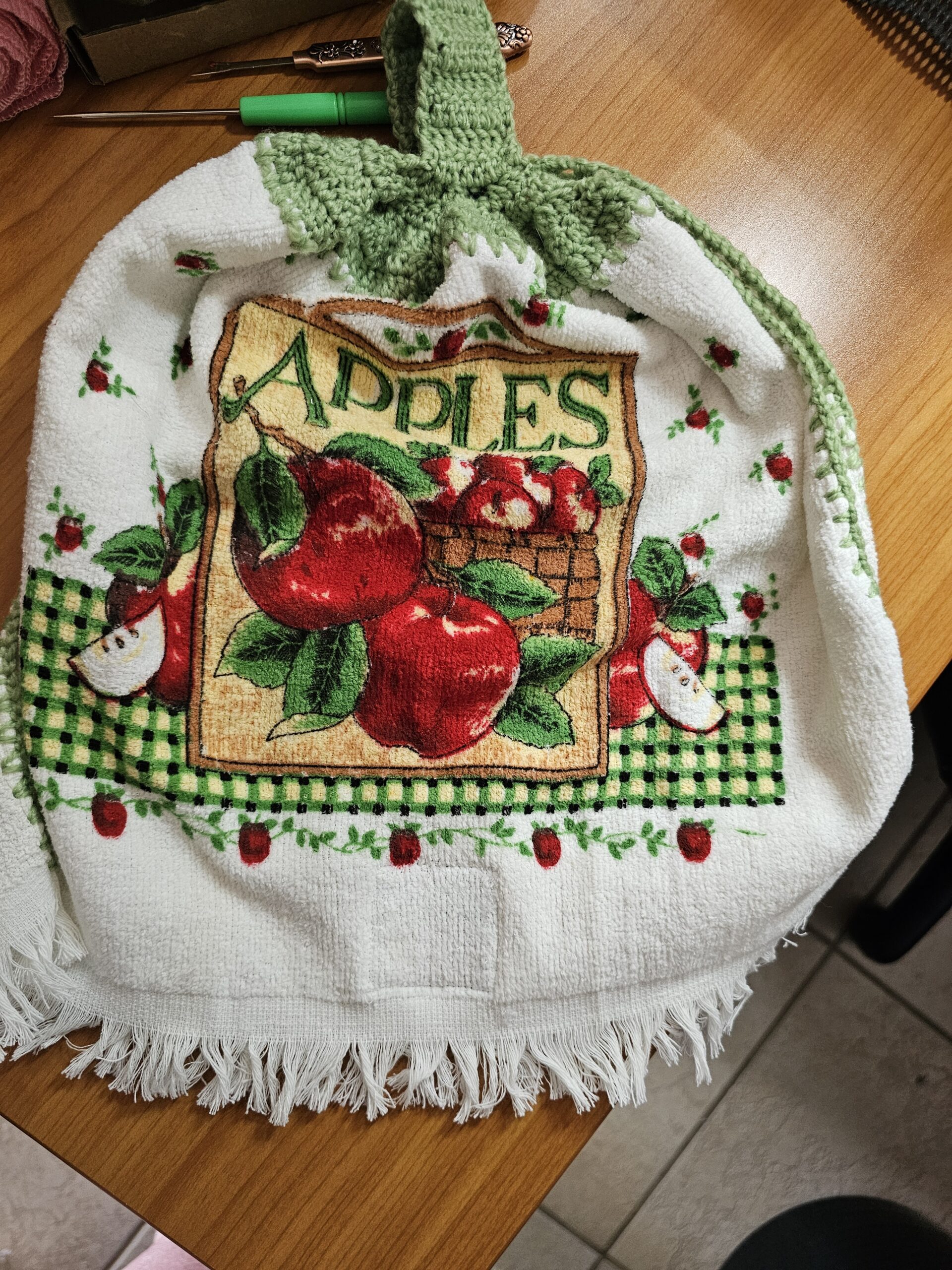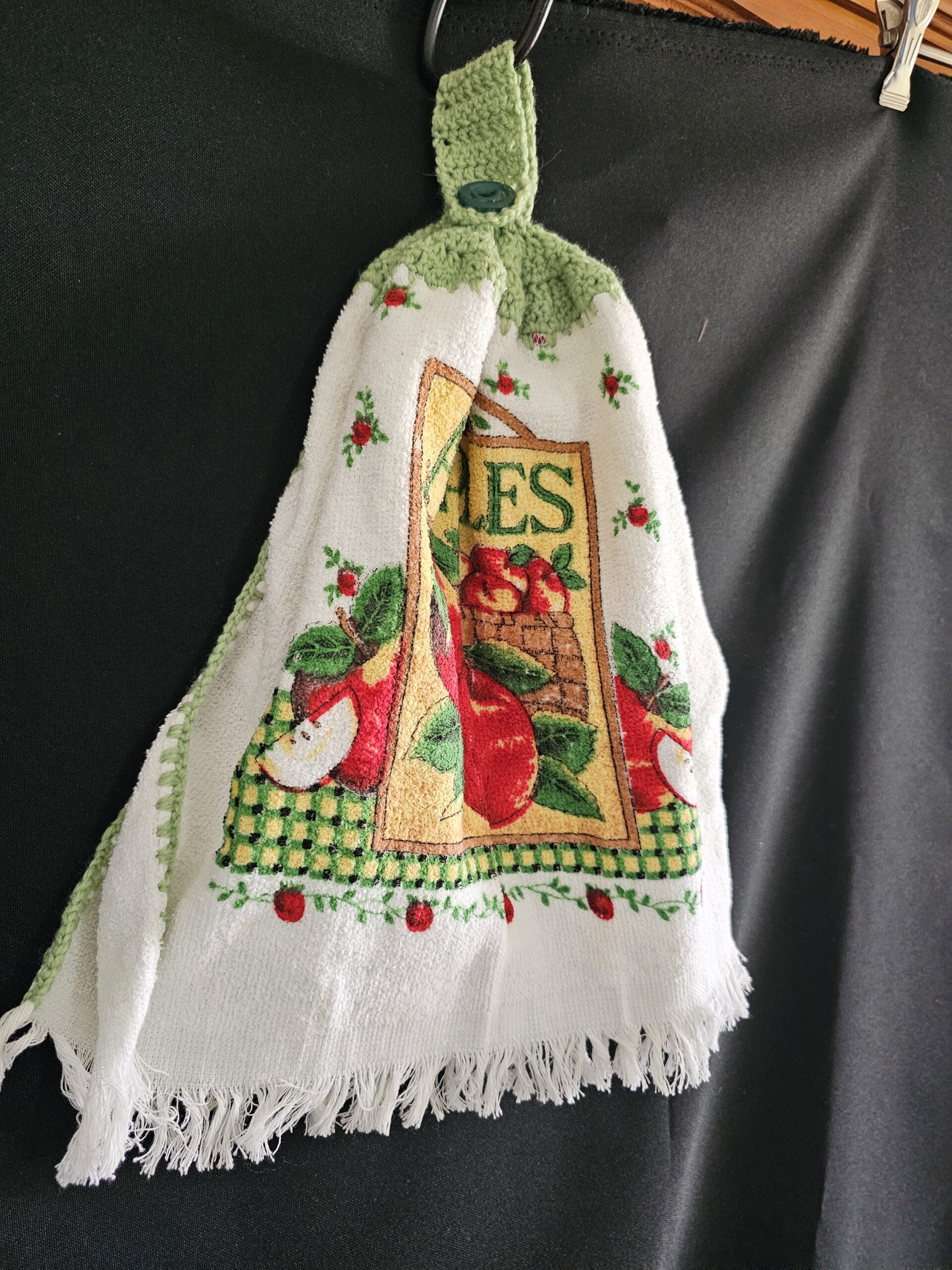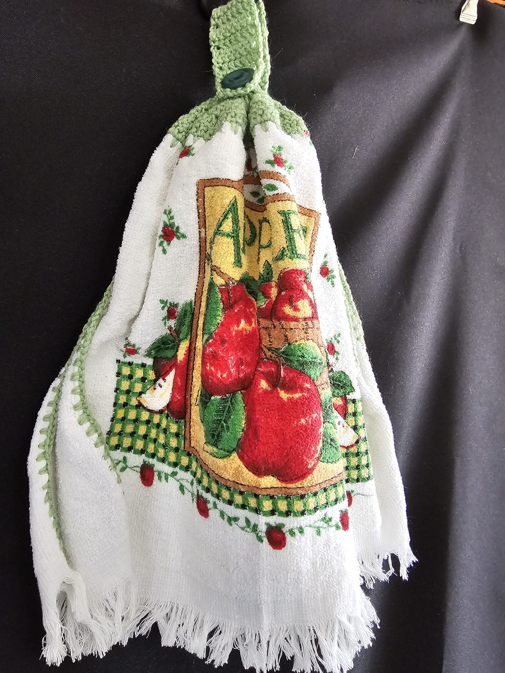 White with Red Apples Tea Towel with Green Coloured Crochet Top and Green Button